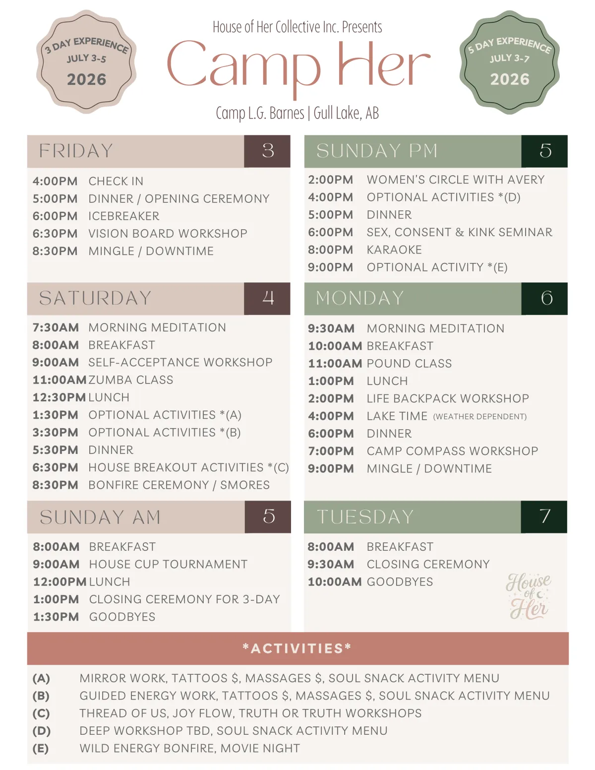 Although all activities are optional, we truly encourage you to participate in all offered activities for the full Camp Her Experience!